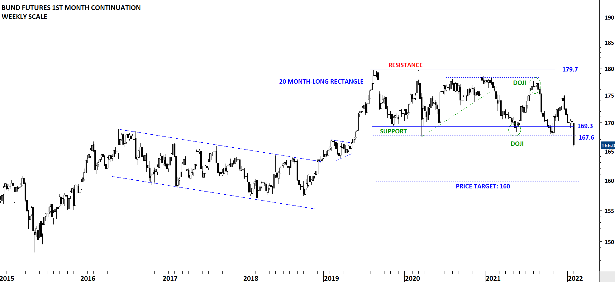 European Bund price had a major selloff this week and broke down the strong support area with a long weekly candle. 167.6-169.3 becomes the new resistance. Rectangle can act as a a top reversal with the price objective of 160 levels.