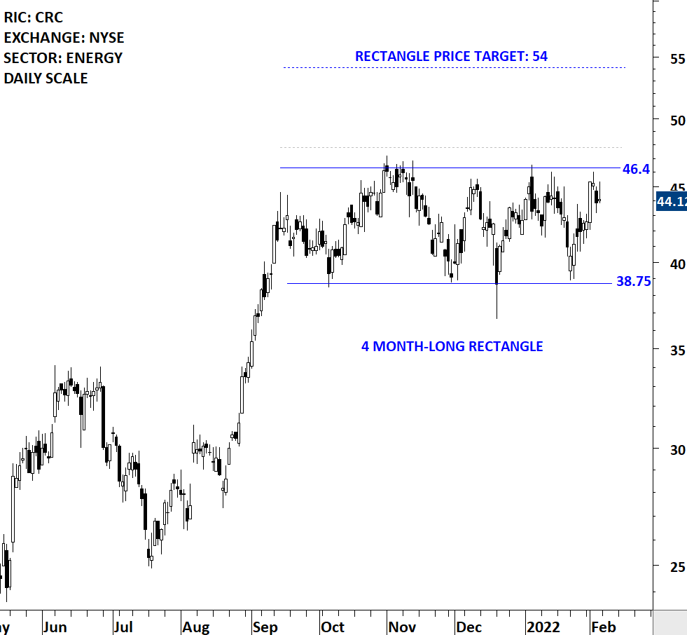 California Resources Corporation is an independent oil and natural gas exploration and production company. The Company is focused on land, mineral, and technical resources for decarbonization by developing carbon capture and storage (CCS) and other emissions-reducing projects. The stock is listed on the New York Stock Exchange. Price chart formed a 4 month-long rectangle with the horizontal boundary acting as strong resistance at 46.40 levels. The horizontal boundary was tested several times over the course of the chart pattern. A daily close above 47.80 levels will confirm the breakout from the 4 month-long rectangle with the possible chart pattern price target of 54.00 levels. (Learn more: Video Tutorial)