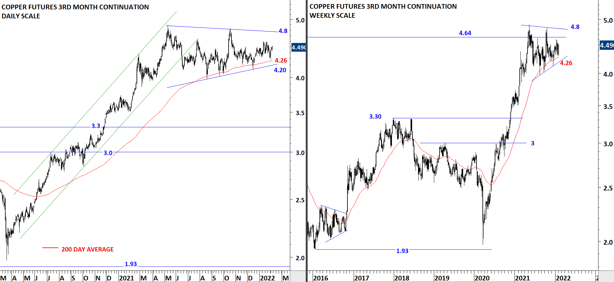 Copper continues to hold above the 200-day moving average. At this point I can conclude that price is in a trading range between 4.26 and 4.8 levels. I’m weighing the possibility of a symmetrical triangle forming between 4.2 and 4.8 levels. Breakdown below the 200-day average can result in a larger scale correction towards the next support at 3.3. As long as price remains above the 200-day average, I will treat this chart as an uptrend.