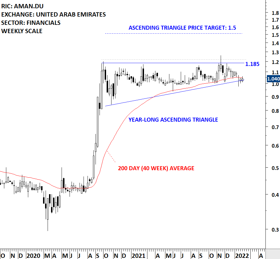 Dubai Islamic Insurance and Reinsurance Company PSC (Aman) is a United Arab Emirates-based company engaged in the provision of all classes of insurance and reinsurance products and services in accordance with the Islamic sharia principles. The stock is listed on the Dubai Stock Exchange. Price chart formed a year-long ascending triangle with the horizontal boundary acting as strong resistance at 1.185 levels. The horizontal boundary was tested several times over the course of the chart pattern. A daily close above 1.22 levels will confirm the breakout from the year-long ascending triangle with the possible chart pattern price target of 1.50 levels. (Learn more: Video Tutorial)