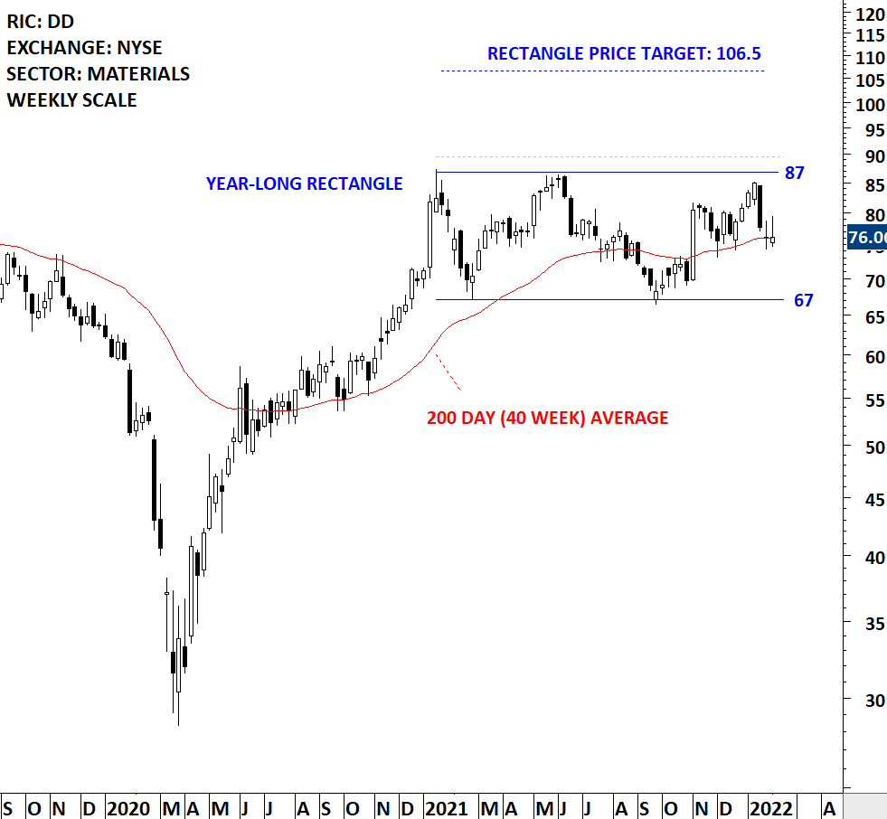 DuPont de Nemours, Inc provides technology-based materials, ingredients and solutions. The Company offers its products and solutions through three segment: Electronics and Imaging, Safety and Construction, and Transportation and Industrial. The stock is listed on the New York Stock Exchange. Price chart formed a year-long rectangle with the horizontal boundary acting as strong resistance at 87.00 levels. The horizontal boundary was tested several times over the course of the chart pattern. A daily close above 89.60 levels will confirm the breakout from the year-long rectangle with the possible chart pattern price target of 106.50 levels. (Learn more: Video Tutorial)