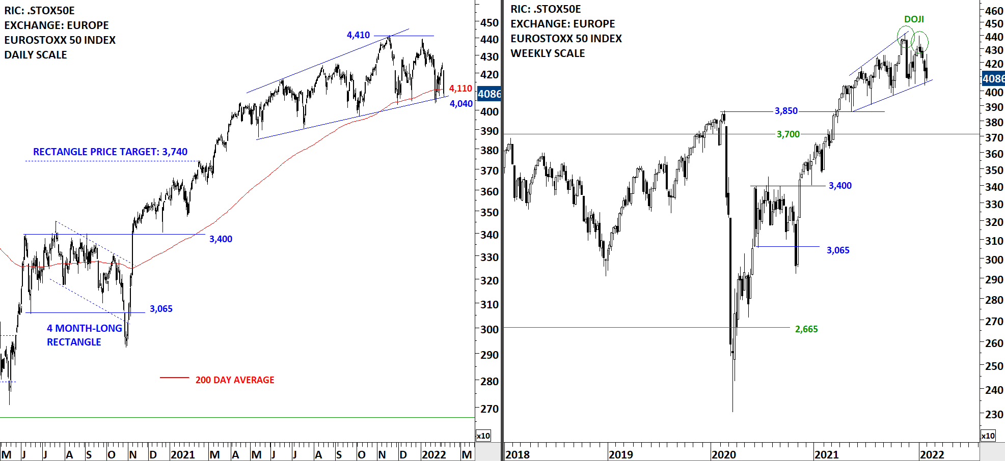Euro Stoxx 50 Index is in a trading range between 4,110 and 4,410 levels. As long as price remains above the 200-day average, I will treat this as a steady uptrend. Breakdown below the 200-day average and the minor low at 4,040 levels can reverse the uptrend and can result in a larger-scale correction. This week’s price action tested the lower boundary of the broadening range. EuroStoxx 50 is at an inflection point.