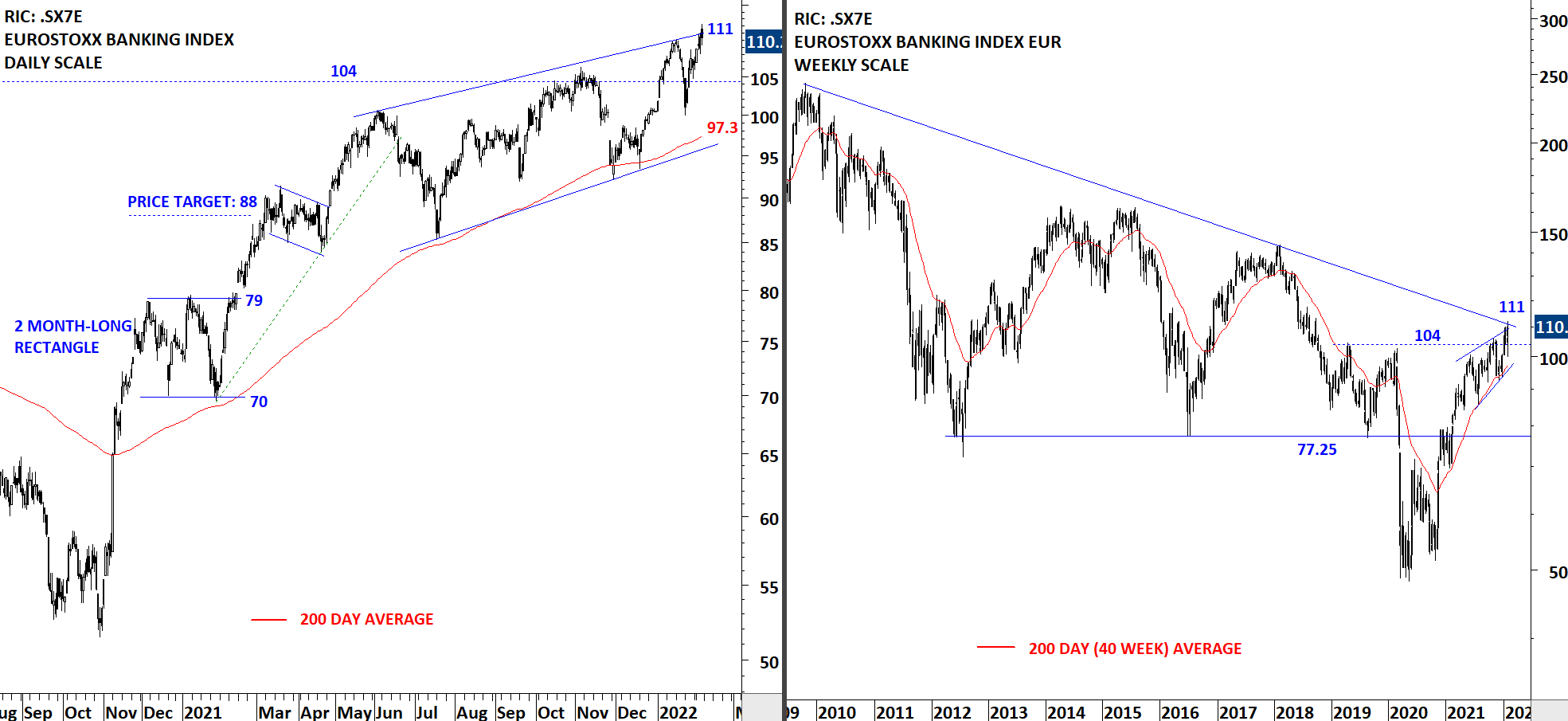 European Banking Index remains in an uptrend. Earlier the index reversed from 111 levels, a strong resistance. The index is in a wide trading range between 96.7 (the 200-day average), and the strong resistance at 111 levels. Compared to EuroStoxx 50 index, European Banks performed much better since the beginning of the year.