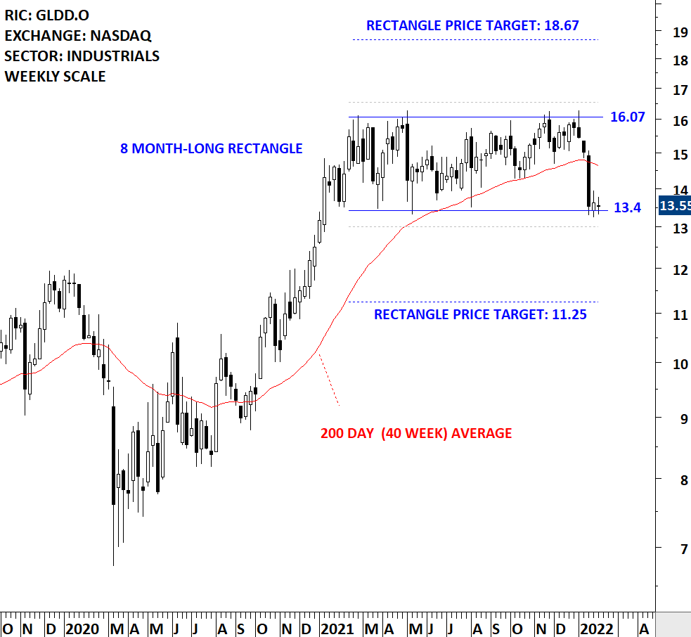 Great Lakes Dredge & Dock Corporation (Great Lakes) is a provider of dredging services. The Company provides dredging services in the East, West and Gulf Coasts of the United States and around the world. The stock is listed on the Nasdaq Stock Exchange. Price chart formed an 8 month-long rectangle with the horizontal boundary acting as strong resistance at 16.07 levels. The horizontal boundary was tested several times over the course of the chart pattern. A daily close above 16.55 levels will confirm the breakout from the 8 month-long rectangle with the possible chart pattern price target of 18.67 levels. Until there is a breakout, rectangle offers trading opportunity between the boundaries. A daily close below 13 levels can confirm the rectangle as a top reversal and target 11.25 levels. (Learn more: Video Tutorial)