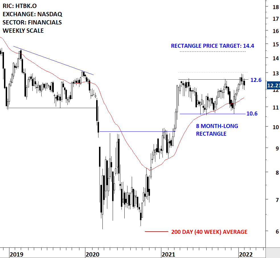 Heritage Commerce Corp is a bank holding company for its wholly owned subsidiary Heritage Bank of Commerce (Bank), provides a range of commercial and personal banking services to residents and the business/professional community in Alameda, Contra Costa, Marin, San Benito, San Francisco, San Mateo, and Santa Clara counties of California. The stock is listed on the Nasdaq Stock Exchange. Price chart formed an 8 month-long rectangle with the horizontal boundary acting as strong resistance at 12.60 levels. The horizontal boundary was tested several times over the course of the chart pattern. A daily close above 13.01 levels will confirm the breakout from the 8 month-long rectangle with the possible chart pattern price target of 14.40 levels. (Learn more: Video Tutorial)