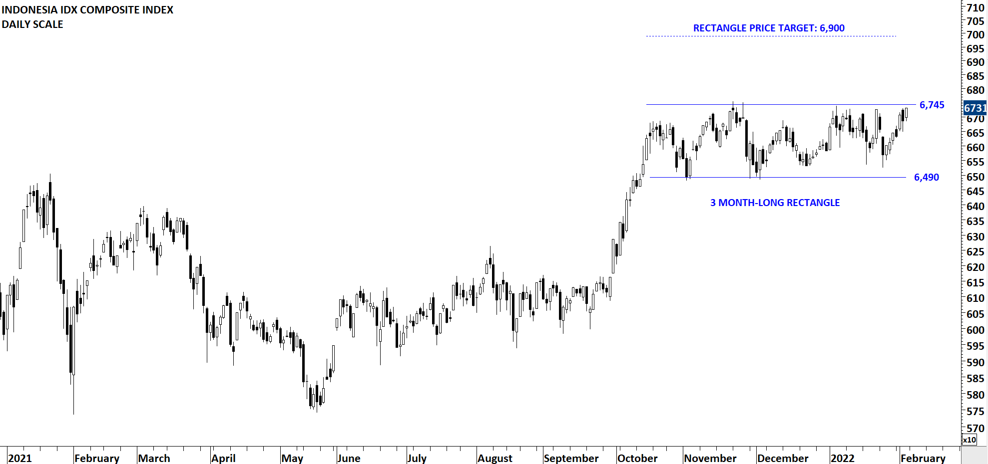 Another text-book rectangle is developing on Indonesia IDX composite index. Though this one is on daily scale and slightly shorter-term than the rectangle on Singapore Index. The upper boundary of the rectangle is forming resistance at 6,745 levels. Breakout can target 6,900 levels.