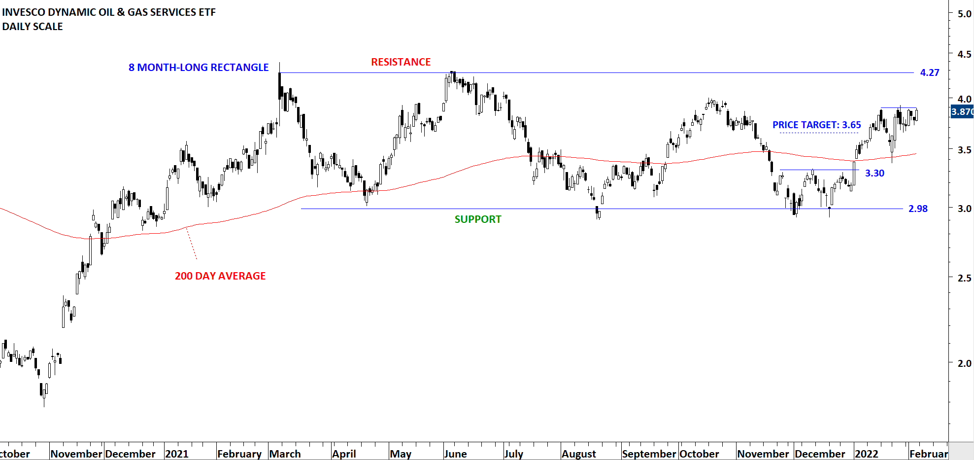 Invesco Dynamic Oil & Gas Services ETF formed an 8 month-long rectangle with the lower boundary acting as support at 2.98 and the upper boundary as resistance at 4.27 levels. The ETF rebounded from the well-defined horizontal support. Short-term double bottom completed with the breakout above neckline at 3.3 levels. Breakout above the minor high at 3.3 levels cleared the 200-day average and met price target at 3.65 levels. PXJ is possibly targeting the upper boundary of its 8 month-long consolidation range at 4.27 levels.