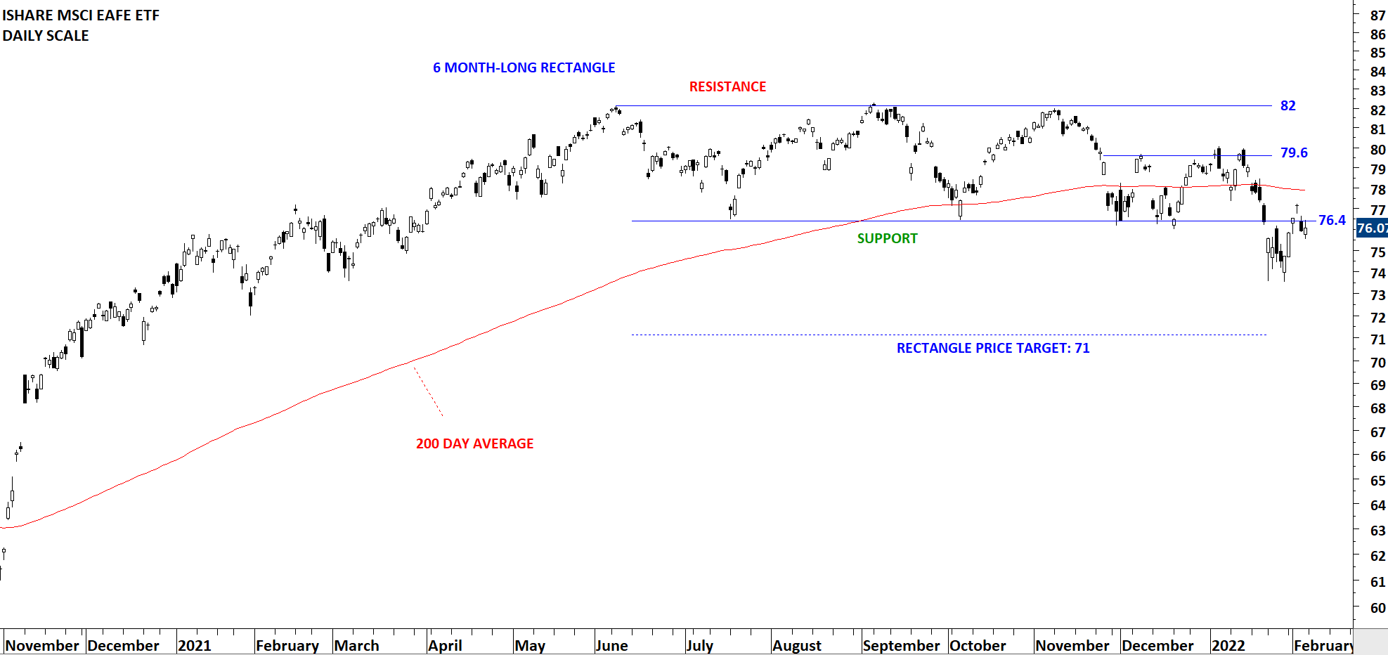 ISHARE MSCI EAFE ETF (EFA) formed a 6 month-long rectangle with the upper boundary acting as resistance at 82 and the lower boundary as support at 76.4 levels. Breakdown below the horizontal support resulted in a top reversal with the price target at 71 levels. Price is below the 200-day average. This week’s price action can be a pullback before the downtrend resumes.