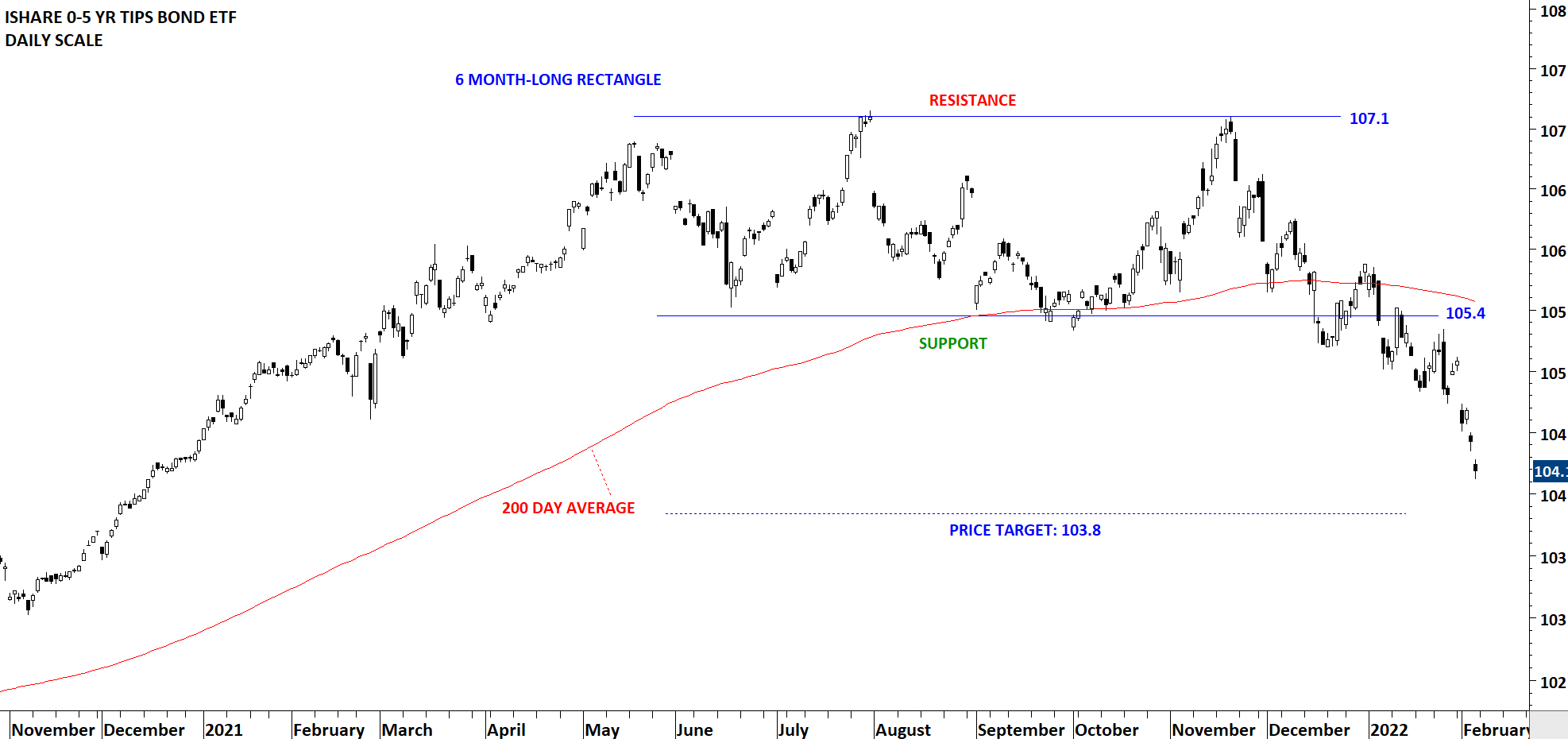 ISHARES 0-5 YR TIPS BOND ETF (STIP.K) formed a 6 month-long rectangle with the lower boundary acting as support at 105.4 and the upper boundary as resistance at 107.1 levels. Breakdown below horizontal support took place with gap opening. Rectangle is acting as a top reversal with price target of 103.8 levels.