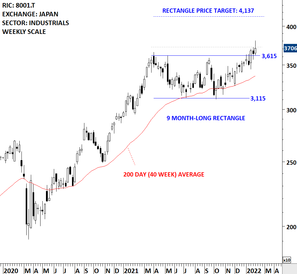 ITOCHU Corporation is a Japan-based trading company. The stock is listed on the Tokyo Stock Exchange. Price chart formed a 9 month-long rectangle with the horizontal boundary acting as strong resistance at 3,615.00 levels. The horizontal boundary was tested several times over the course of the chart pattern. A daily close above 3,723.00 levels will confirm the breakout from the 9 month-long rectangle with the possible chart pattern price target of 4,137.00 levels. Breakout can push the stock to all-time highs. (Learn more: Video Tutorial)