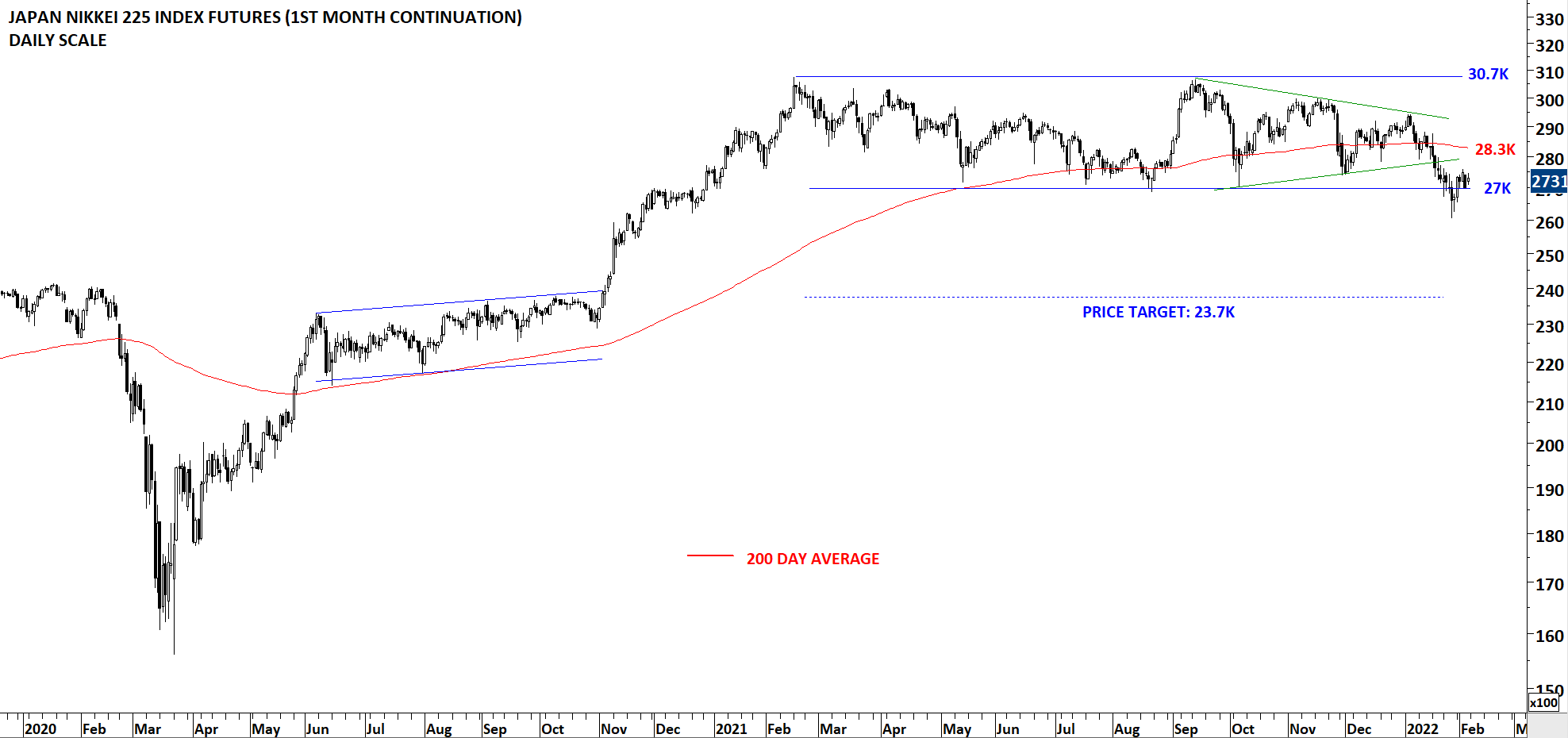 Japan’s NIKKEI 225 Index recovered above the lower boundary at 27K levels. I still continue to monitor this chart with a bearish bias. Price is below the long-term average and has strong resistances ahead. A recovery above 28.3K can change my bearish view.
