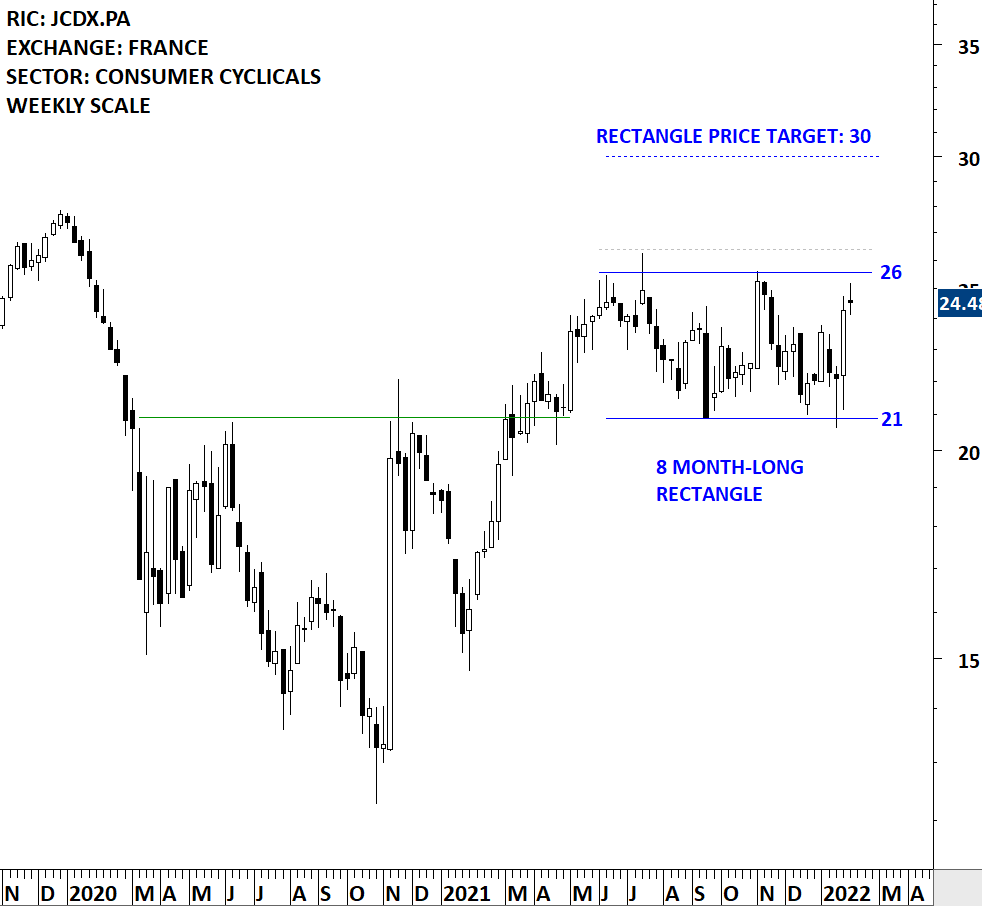 JCDecaux SA is a France-based outdoor advertising company. It divides its business into three main sectors: Advertising on Street Furniture, Billboards and Transport Advertising. The stock is listed on the Paris Stock Exchange. Price chart formed an 8 month-long rectangle with the horizontal boundary acting as strong resistance at 26.00 levels. The horizontal boundary was tested several times over the course of the chart pattern. A daily close above 26.40 levels will confirm the breakout from the 8 month-long rectangle with the possible chart pattern price target of 30.00 levels. (Learn more: Video Tutorial)
