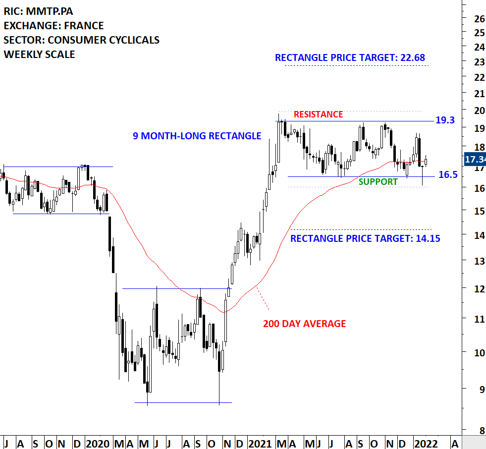 Metropole Television SA is a France-based audiovisual company that specializes in the production, distribution and marketing of television (TV) programs. The stock is listed on the Paris Stock Exchange. Price chart formed a 9 month-long rectangle with the horizontal boundary acting as strong support at 16.50 levels. Both boundaries were tested several times over the course of the chart pattern. A daily close above 19.9 levels will confirm the breakout from the 9 month-long rectangle with the possible chart pattern price target of 22.68 levels. Until there is a breakout in one direction the stock offers trading opportunity. A daily close below 16.15 will confirm the rectangle as a reversal with the price objective at 14.15 levels. (Learn more: Video Tutorial)