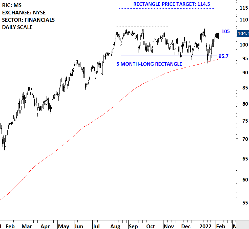 Morgan Stanley offers financial services. Through its subsidiaries, it provides a variety of products and services to a group of clients and customers, including corporations, governments, financial institutions and individuals. The stock is listed on the New York Stock Exchange. Price chart formed a 5 month-long rectangle with the horizontal boundary acting as strong resistance at 105.00 levels. The horizontal boundary was tested several times over the course of the chart pattern. A daily close above 107.00 levels will confirm the breakout from the 5 month-long rectangle with the possible chart pattern price target of 114.50 levels. For now the stock offers trading opportunity between the boundaries. (Learn more: Video Tutorial)