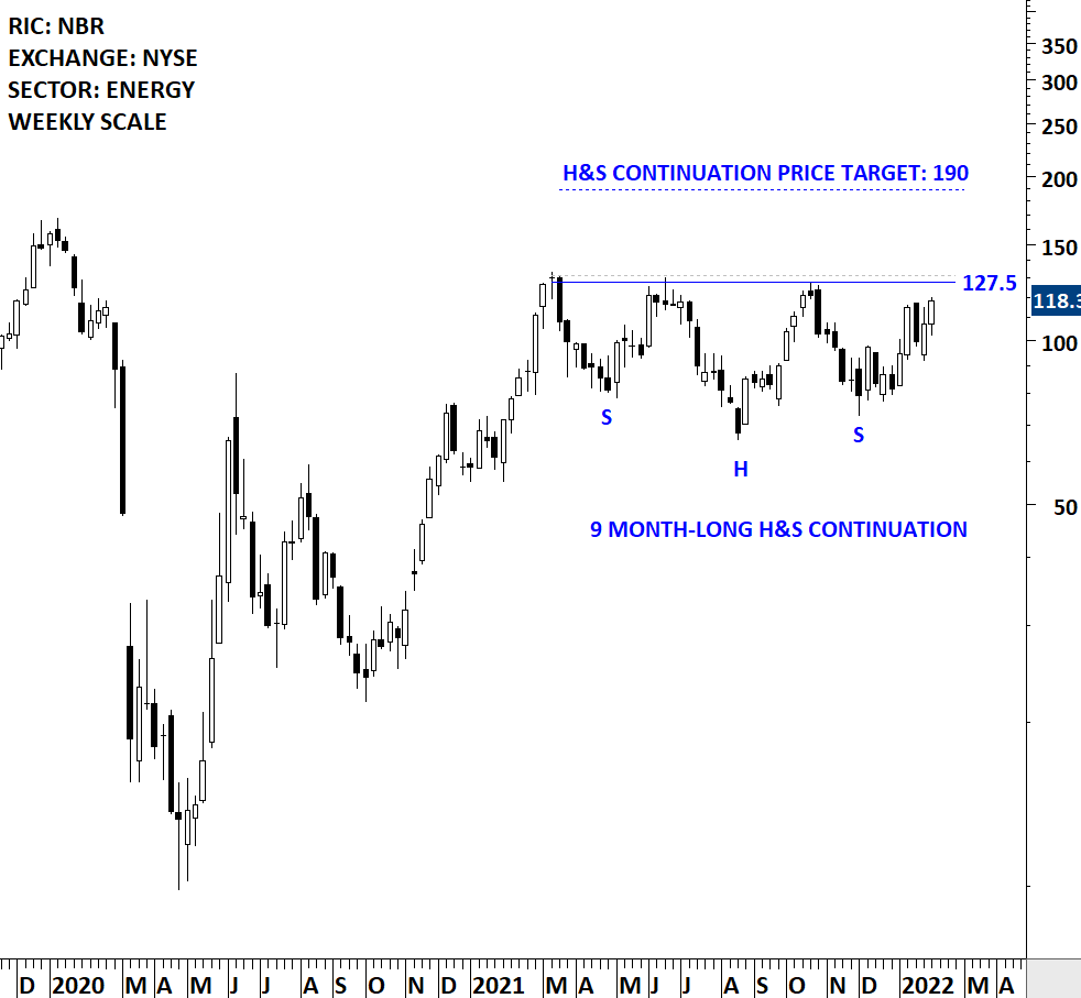 Nabors Industries Ltd. owns and operates a land-based drilling rig fleet. The Company is a provider of offshore platform drilling rigs in the United States and multiple international markets. The stock is listed on the New York Stock Exchange. Price chart formed a 9 month-long head and shoulder continuation with the horizontal boundary acting as strong resistance at 128.00 levels. The horizontal boundary was tested several times over the course of the chart pattern. A daily close above 132.00 levels will confirm the breakout from the 9 month-long head and shoulder continuation with the possible chart pattern price target of 187.00 levels. (Learn more: Video Tutorial)