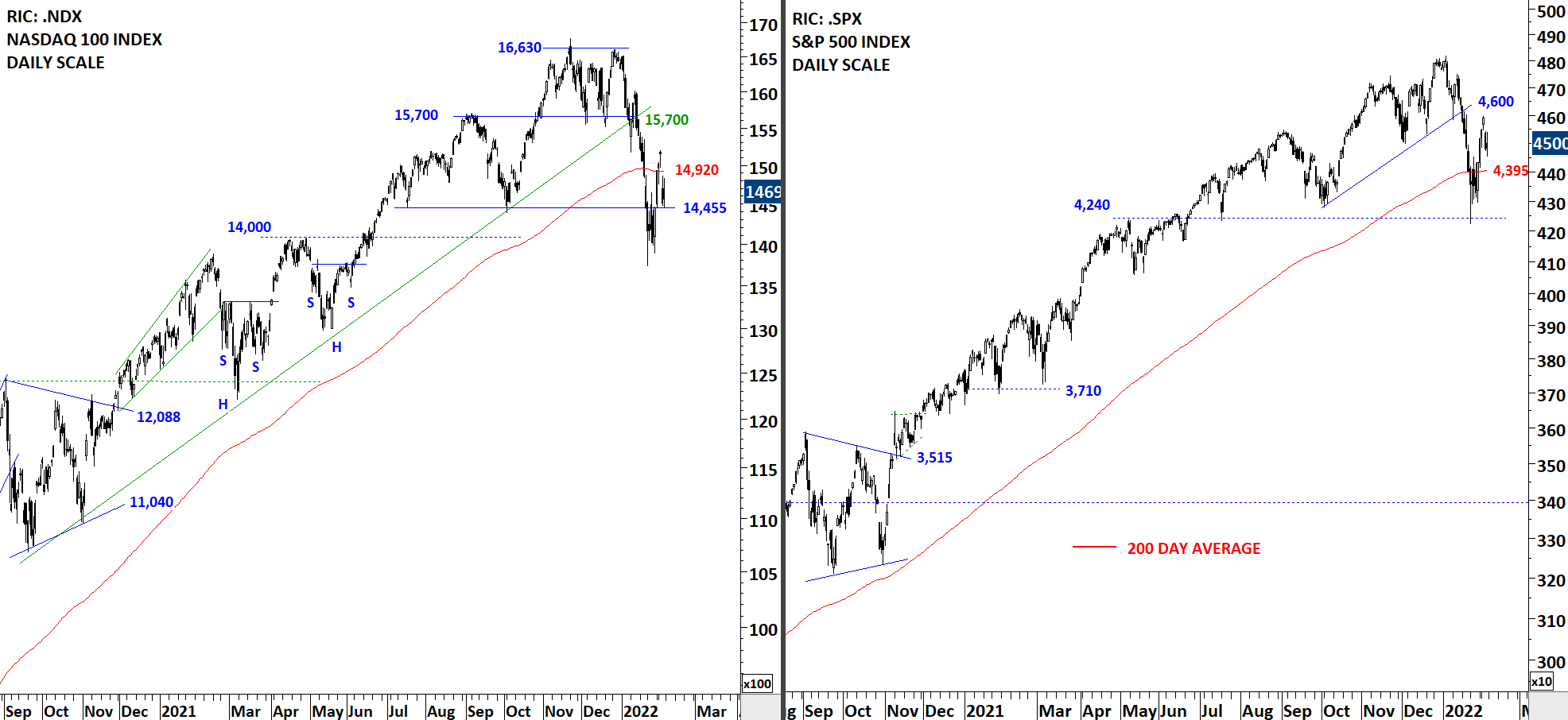 Nasdaq 100 found resistance at the 200-day average. S&P 500 Index climbed above its year-long average at 4,935 levels. Both indices are looking for direction. We either recover and settle above the 200-day averages and resume the uptrend, or fail and resume corrections to lower levels below the 200-day. There is mixed messages between the U.S. equity benchmarks.