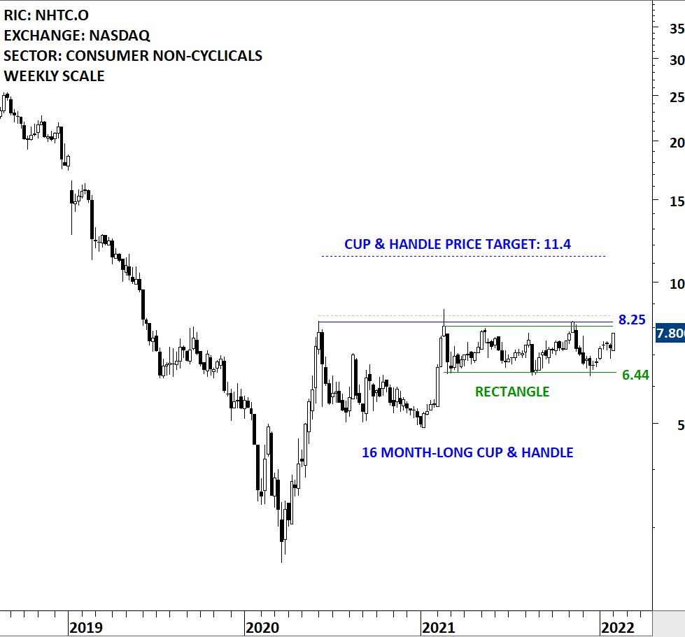 Natural Health Trends Corp. is an international direct-selling and e-commerce company. The Company offers a line of Natural Health Trends (NHT) Global branded products in seven categories: wellness, herbal, beauty, lifestyle, home, baby and daily. The stock is listed on the Nasdaq Stock Exchange. Price chart formed a 16 month-long cup & handle continuation with the horizontal boundary acting as strong resistance at 8.25 levels. The horizontal boundary was tested several times over the course of the chart pattern. A daily close above 8.50 levels will confirm the breakout from the 16 month-long cup & handle continuation with the possible chart pattern price target of 11.40 levels. The handle part of the pattern can be identified as a rectangle. The rectangle itself offers trading opportunity between boundaries. (Learn more: Video Tutorial)