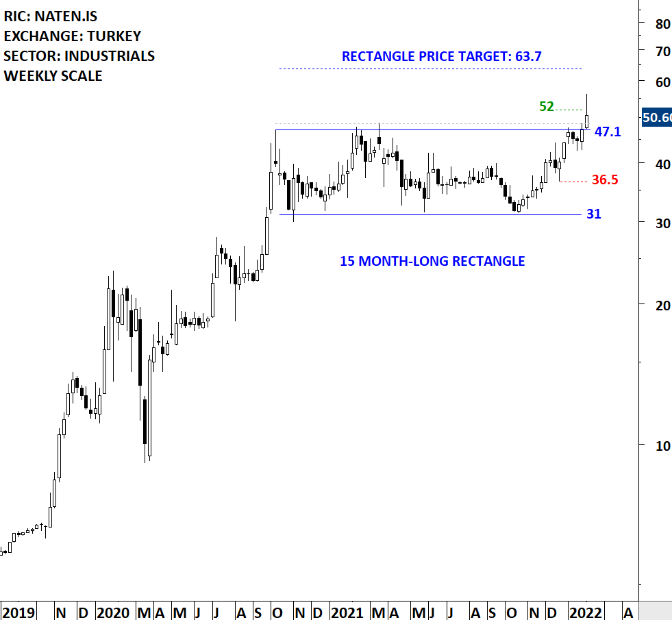 Naturel Yenilenebilir Enerji Ticaret AS is a Turkey-based company engaged in the renewable energy sector. The stock is listed on the Istanbul Stock Exchange. Price chart formed a 15 month-long rectangle with the horizontal boundary acting as strong resistance at 47.10 levels. The horizontal boundary was tested several times over the course of the chart pattern. The daily close above 48.50 levels confirmed the breakout from the 15 month-long rectangle with the possible chart pattern price target of 63.70 levels. Breakout pushed the stock to all-time highs. (Learn more: Video Tutorial)