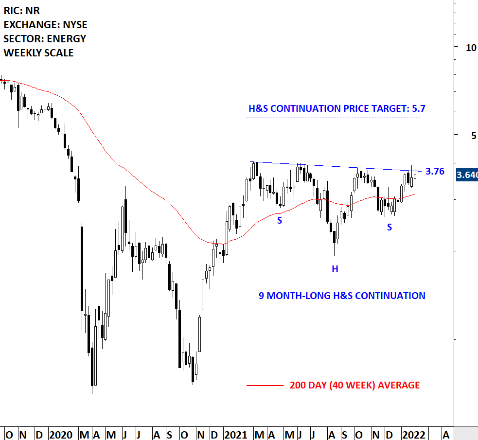 Newpark Resources, Inc. is a geographically diversified supplier providing products, as well as rentals and services to customers across multiple industries. Its segments include Fluids Systems and Industrial Solutions. The Fluids Systems segment primarily provides customized drilling, completion, and stimulation fluids solutions to oil and natural gas exploration and production (E&P) customers primarily in North America and Europe, the Middle East and Africa (EMEA), as well as certain countries in the Asia Pacific and Latin America. The Industrial Solutions segment includes Site and Access Solutions business, along with Industrial Blending operations. Its Site and Access Solutions provides composite matting system rentals utilized for temporary worksite access, along with related site construction and services to customers in various markets including power transmission, E&P, pipeline, renewable energy, petrochemical, construction and other industries in the United States and Europe. The stock is listed on the New York Stock Exchange. Price chart formed a 9 month-long head and shoulder continuation with the neckline (slightly downward sloping) acting as strong resistance at 3.76 levels. The neckline was tested several times over the course of the chart pattern. A daily close above 3.87 levels will confirm the breakout from the 9 month-long head and shoulder continuation with the possible chart pattern price target of 5.70 levels. (Learn more: Video Tutorial)