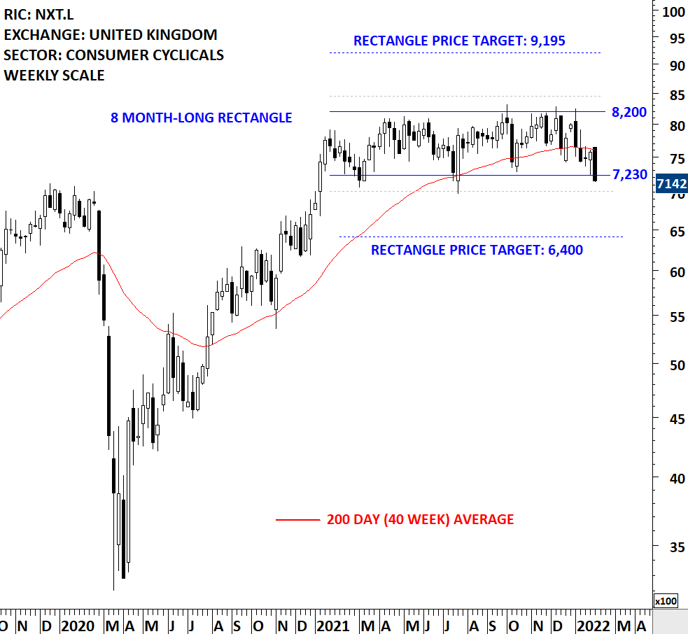 NEXT plc is a United Kingdom-based retailer offering clothing, footwear, accessories, beauty and home products. The stock is listed on the London Stock Exchange. Price chart formed an 8 month-long rectangle with the horizontal boundary acting as strong resistance at 8,200.00 levels. The horizontal boundary was tested several times over the course of the chart pattern. A daily close above 8,445.00 levels will confirm the breakout from the 8 month-long rectangle with the possible chart pattern price target of 9,195.00 levels. A daily close below 7,010 levels can confirm the rectangle as a top reversal with the price target of 6,400 levels. (Learn more: Video Tutorial)