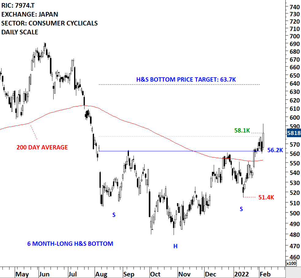 Nintendo Co., Ltd. is mainly engaged in the development, manufacture and sale of entertainment products in home entertainment field. The Company’s main products include game machines such as portable and console game machines and software, as well as trump and Carta (Japanese-style playing cards). The stock is listed on the Tokyo Stock Exchange. Price chart formed a 6 month-long head and shoulder bottom with the horizontal boundary acting as strong resistance at 56,200.00 levels. The horizontal boundary was tested several times over the course of the chart pattern. The daily close above 57,800.00 levels confirmed the breakout from the 6 month-long head and shoulder bottom with the possible chart pattern price target of 63,700.00 levels. (Learn more: Video Tutorial)