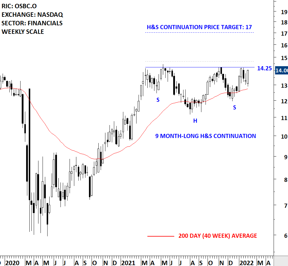 Old Second Bancorp, Inc. is bank holding Company. The Company through its wholly-owned subsidiary bank, Old Second National Bank (the Bank), offers a range of financial services. The stock is listed on the Nasdaq Stock Exchange. Price chart formed a 9 month-long head and shoulder continuation with the horizontal boundary acting as strong resistance at 14.25 levels. The horizontal boundary was tested several times over the course of the chart pattern. A daily close above 14.67 levels will confirm the breakout from the 9 month-long head and shoulder continuation with the possible chart pattern price target of 17.00 levels. (Learn more: Video Tutorial)
