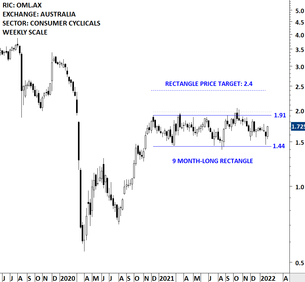 oOh!media Limited is an Australia-based out-of-home (OOH) media company. The Company offers advertisers the platform to create engagement between people and brands through its portfolios in Australia and New Zealand. The stock is listed on the Australia Stock Exchange. Price chart formed a 9 month-long rectangle with the horizontal boundary acting as strong resistance at 1.91 levels. The horizontal boundary was tested several times over the course of the chart pattern. A daily close above 1.97 levels will confirm the breakout from the 9 month-long rectangle with the possible chart pattern price target of 2.40 levels. (Learn more: Video Tutorial)