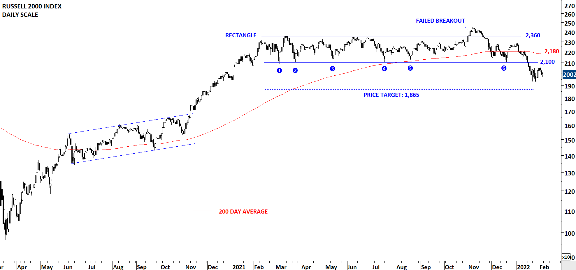 After breaking down support at 2,100 levels the index trended towards the price target at 1,865 levels. In case of a larger scale correction this can be a conservative price target. Russell 2000 can target much lower levels. 2,100 will act as resistance. The index is now clearly below the 200-day average. If this week’s price action was a pullback, we can expect continuation of the downtrend below the 200-day average.