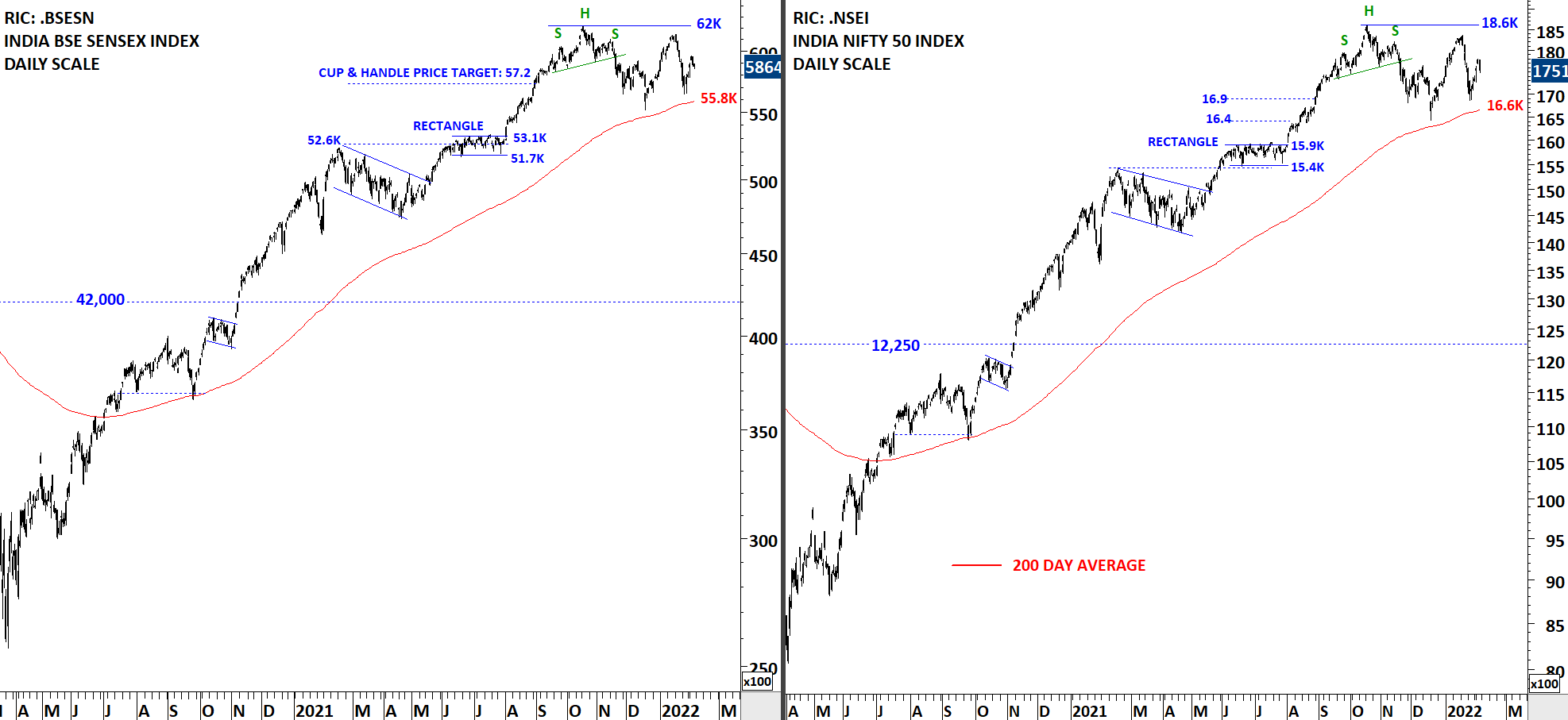 Both Nifty 50 and Sensex has been in a strong and steady uptrend. For Sensex, short-term resistance stands at 62K and for Nifty it is at 18.6K. Wide trading range is between the 200-day averages and the minor highs. There is no clear top reversal chart pattern on both indices. As long as price remains above the 200-day average, I will treat both charts as in an uptrend.