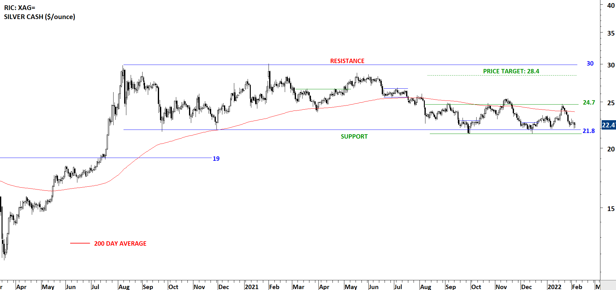 Silver remains range bound between 21.8 and 30 levels. There is also another short-term consolidation range between 21.8 and 24.7 levels. I’m weighing the possibility of a double bottom (rectangle reversal) with the neckline standing at 24.7 levels. Failure to recover above the year-long average and target 24.7 levels can increase the likelihood of the latest consolidation becoming a bearish continuation. In that case I will closely monitor horizontal support at 21.8 levels.