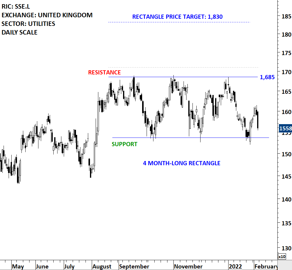 SSE PLC is an energy company. The Company is engaged in the generation, transmission, distribution and supply of electricity, in the production, storage, distribution and supply of gas and in other energy services. The stock is listed on the London Stock Exchange. Price chart formed a 4 month-long rectangle with the horizontal boundary acting as strong resistance at 1,685.00 levels. The horizontal boundary was tested several times over the course of the chart pattern. A daily close above 1,710.00 levels will confirm the breakout from the 4 month-long rectangle with the possible chart pattern price target of 1,830.00 levels. The stock offers trading opportunity between the boundaries. (Learn more: Video Tutorial)