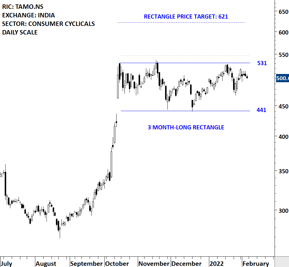 Tata Motors Limited is an automobile company. The Company is engaged in manufacture of motor vehicles. The Company’s segments include automotive operations and all other operations. The stock is listed on the National Stock Exchange. Price chart formed a 3 month-long rectangle with the horizontal boundary acting as strong resistance at 531.00 levels. The horizontal boundary was tested several times over the course of the chart pattern. A daily close above 547.00 levels will confirm the breakout from the 3 month-long rectangle with the possible chart pattern price target of 621.00 levels. (Learn more: Video Tutorial)