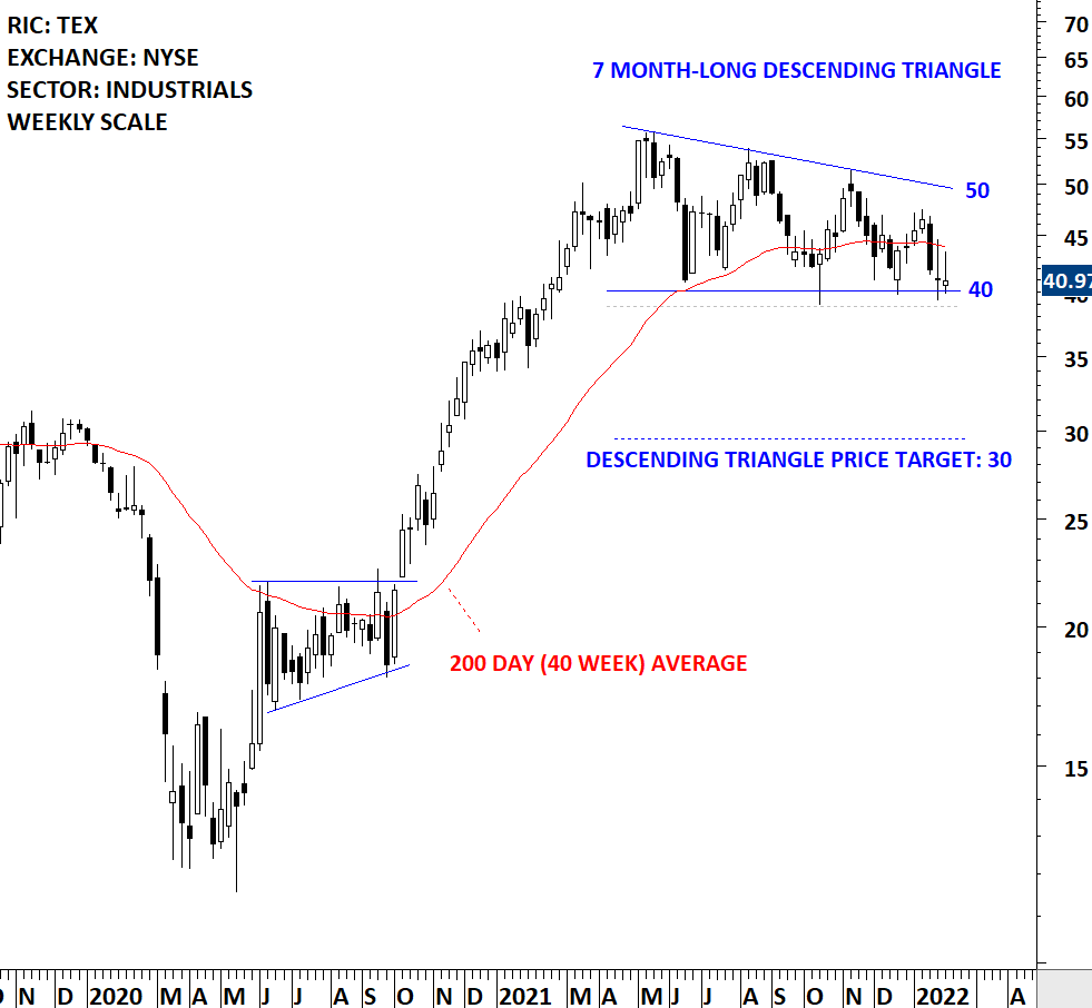 Terex Corporation designs, builds, and supports products used in construction, maintenance, manufacturing, energy, minerals, and materials management applications. The stock is listed on the New York Stock Exchange. Price chart formed a 7 month-long descending triangle with the horizontal boundary acting as strong support at 40.00 levels. The horizontal boundary was tested several times over the course of the chart pattern. A daily close below 38.80 levels will confirm the breakdown from the 7 month-long descending triangle with the possible chart pattern price target of 30.00 levels. Descending triangle can act as top reversal. (Learn more: Video Tutorial)