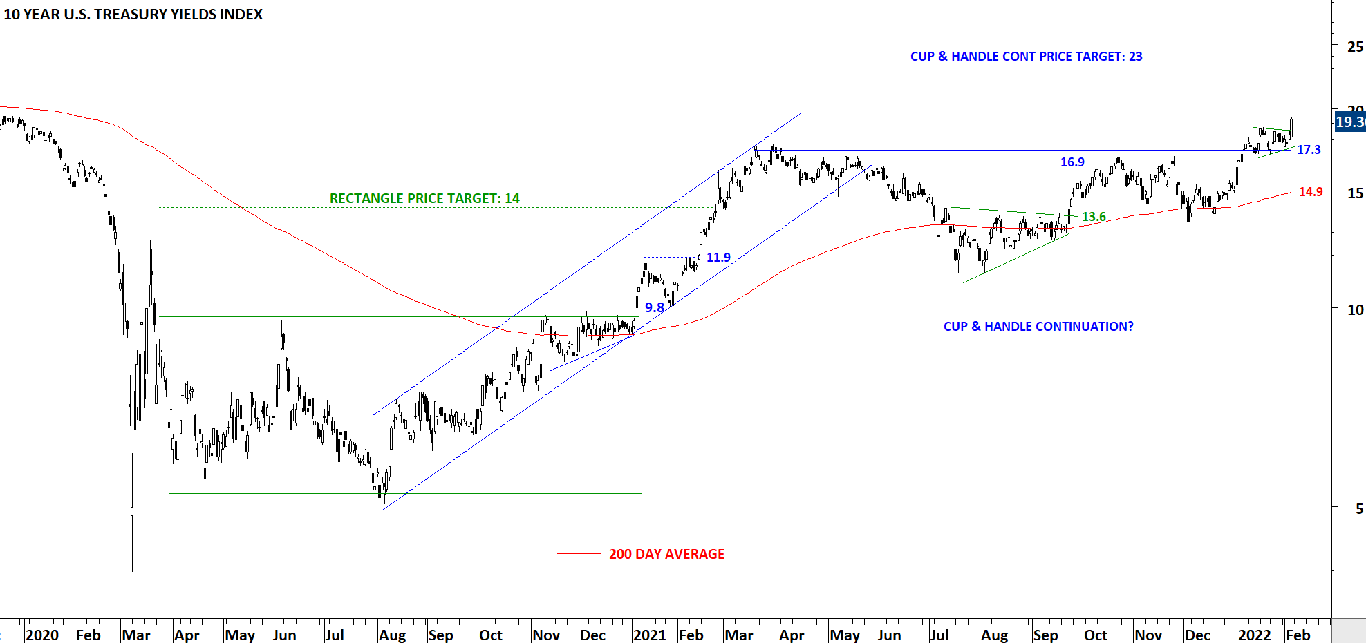 The chart below is the 10 Year U.S. Treasury Yield Index. Yields possibly completed a multi-month long cup & handle continuation with the horizontal boundary that was acting as resistance at 17 levels. I am now monitoring this chart as a completed cup & handle with the price target of 23 levels. 17.3 becomes the new support. Latest short-term consolidation was possibly a bullish pennant that resumed the uptrend.