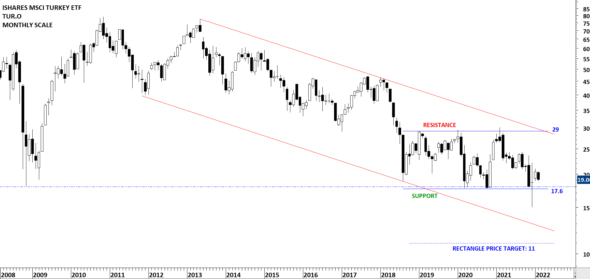 Volatility/weakness on Turkish Lira continues and the ETF is trying to hold above the lower boundary of its multi-year long consolidation at 17.6 levels. This is a monthly scale price chart and long-term consolidation is between 17.6 and 29 levels. Breakdown below 17.6 levels (consecutive daily closes) will suggest lower prices towards the chart pattern price target at 11. For now the trading range between 17.6 and 29 levels is intact.
