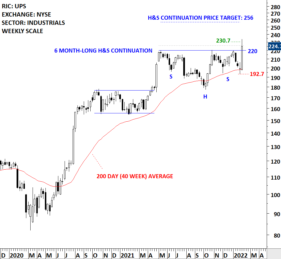 United Parcel Service, Inc. (UPS) is a package delivery company. The Company is a provider of global supply chain management solutions. The Company operates through three segments: U.S. Domestic Package operations, International Package operations, and Supply Chain & Freight operations. The stock is listed on the New York Stock Exchange. Price chart formed a 6 month-long head and shoulder continuation with the horizontal boundary acting as strong resistance at 220.00 levels. The horizontal boundary was tested several times over the course of the chart pattern. The daily close above 226.00 levels confirmed the breakout from the 6 month-long head and shoulder continuation with the possible chart pattern price target of 256.00 levels. (Learn more: Video Tutorial)