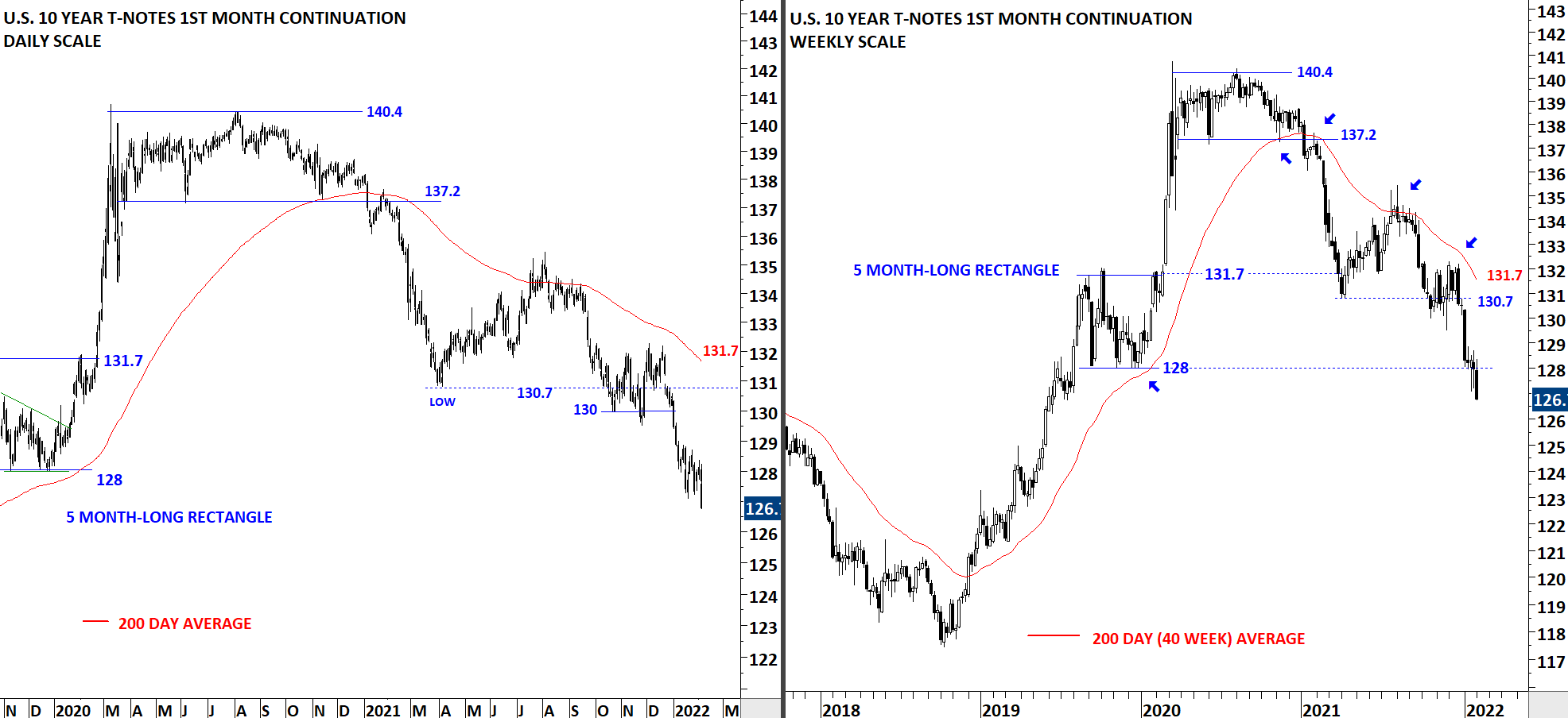 The U.S. 10 Year T-Note broke down the support area between 130 and 130.7. The 200-day moving average is forming resistance at 131.7 levels. Breakdown below 130 levels resumed the downtrend. 130-130.7 area becomes resistance. U.S. Treasuries are in a downtrend below the 200-day average.
