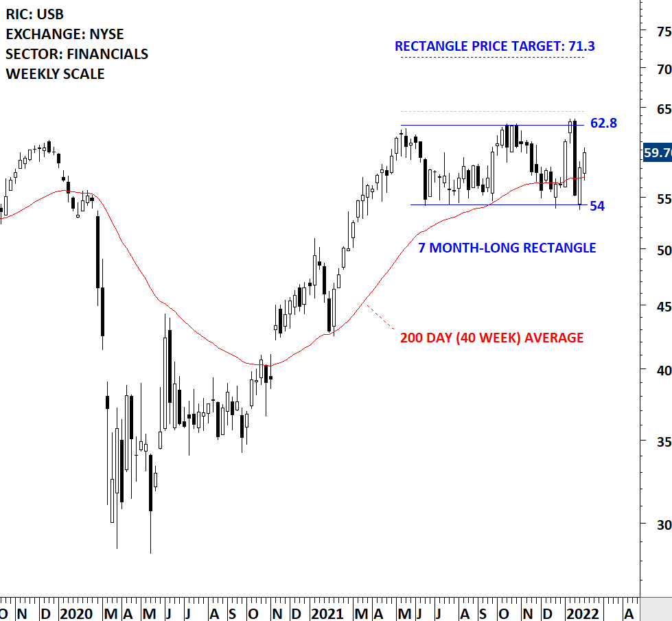 U.S. Bancorp is a financial services holding company. The Company provides a range of financial services, including lending and depository services, cash management, capital markets, and trust and investment management services. The stock is listed on the New York Stock Exchange. Price chart formed a 7 month-long rectangle with the horizontal boundary acting as strong resistance at 62.80 levels. The horizontal boundary was tested several times over the course of the chart pattern. A daily close above 64.50 levels will confirm the breakout from the 7 month-long rectangle with the possible chart pattern price target of 71.30 levels. Until there is a breakout the stock offers trading opportunity between boundaries. (Learn more: Video Tutorial)