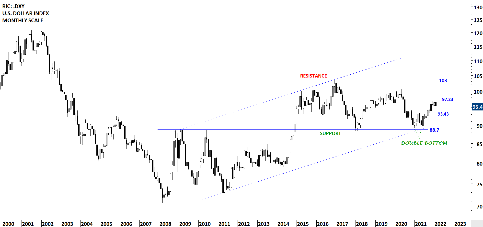 The Dollar Index is holding above 93.43 levels. Breakout above 93.43 was followed by a steady uptrend towards the price target at 97.23 levels. Previous resistance at 93.43 levels becomes the new support. Long-term price chart shows a wide range between 88.7 and 103 levels.