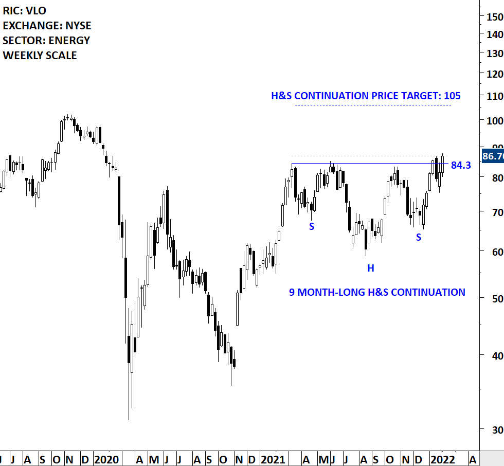 Valero Energy Corporation (Valero) is an is an international manufacturer and marketer of transportation fuels and petrochemical products. The Company’s segments include refining, renewable diesel, and ethanol. The stock is listed on the New York Stock Exchange. Price chart formed a 9 month-long head and shoulder continuation with the horizontal boundary acting as strong resistance at 84.30 levels. The horizontal boundary was tested several times over the course of the chart pattern. A daily close above 86.80 levels will confirm the breakout from the 9 month-long head and shoulder continuation with the possible chart pattern price target of 105.00 levels. (Learn more: Video Tutorial)