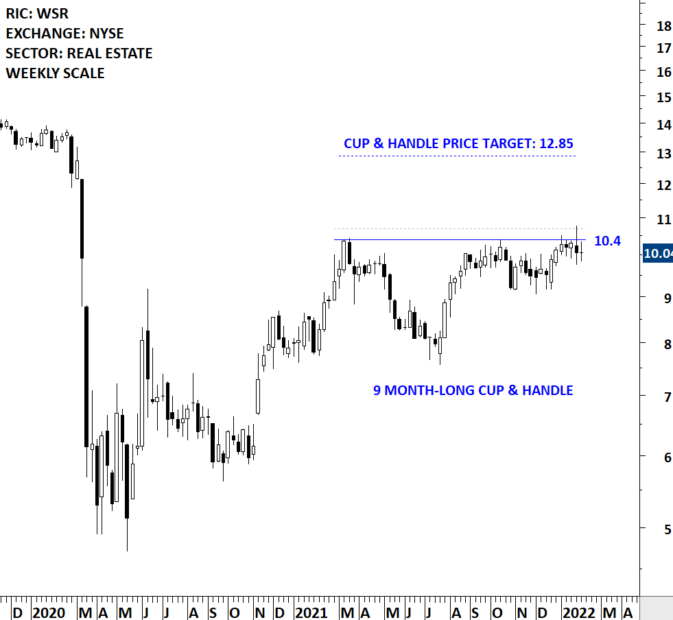 Whitestone REIT is a real estate investment trust, which is engaged in owning and operating commercial properties in culturally diverse markets in the metropolitan areas. The Company’s acquisition targets are located in densely populated, culturally diverse neighborhoods, primarily in and around Austin, Chicago, Dallas-Fort Worth, Houston, Phoenix and San Antonio. The stock is listed on the New York Stock Exchange. Price chart formed a 9 month-long cup & handle continuation with the horizontal boundary acting as strong resistance at 10.40 levels. The horizontal boundary was tested several times over the course of the chart pattern. A daily close above 10.70 levels will confirm the breakout from the 9 month-long cup & handle continuation with the possible chart pattern price target of 12.85 levels. (Learn more: Video Tutorial)