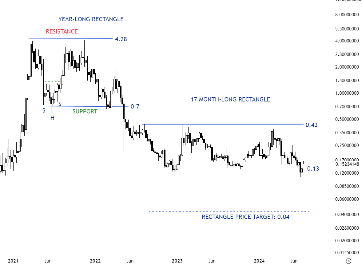 ALPHAUS chart pattern is morphing possibly into a rectangle. Sharp recovery from support at 0.065 levels reached the horizontal resistance at 0.19 levels which is now the upper boundary of the rectangle. Re-test of 0.065 levels risks breakdown of the rectangle and continuation of the existing downtrend. Breakdown below 0.065 levels can confirm the rectangle as a bearish continuation with a price target of 0.023 levels. Until there is a breakdown the pattern will offer trading opportunity between the well-defined boundaries. Strong rebound from the lower boundary can result in a retest of the horizontal resistance at 0.19 levels.