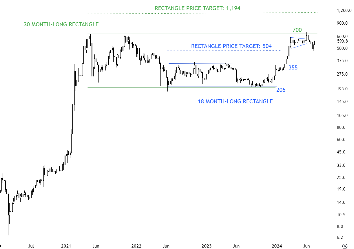 BNBUSD completed an 18 month-long rectangle with the upper boundary acting as resistance at 355 levels. Breakout pushed the price towards the rectangle price target at 504 levels. There is a larger scale rectangle pattern between 206 and 700 levels. This is a well-defined consolidation. Both boundaries are recognized by market participants. It is important to have boundaries that are not violated by spikes, it shows that market recognized those levels and buyers and sellers acted around the horizontal lines. Previous resistance at 355 levels becomes the new support. Breakout above 700 levels will be a long-term bullish signal and target 1,194 levels.