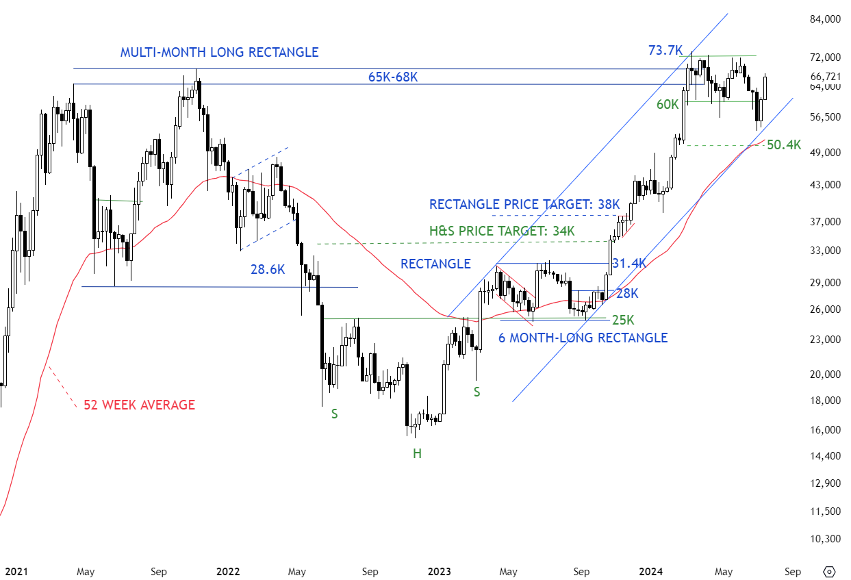 BTCUSD quickly recovered above 60K, stressing the importance of focusing on the longer-term trend channel and the year-long average. I’ve adjusted the boundaries of the uptrend channel. The lower boundary is overlapping with the 52 week average (year-long) Uptrend will remain intact as long as price stays above the year-long average. Strong resistance is at 73.7K. Price can remain in the trend channel and below all-time highs and build more energy for the possible breakout to new highs.