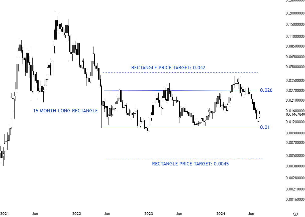 CELRUSD is a pair with a well-defined rectangle chart pattern. The pair completed a 15 month-long rectangle chart pattern with the breakout above 0.026 levels. Price tried to hold above the horizontal support. Failure to hold the horizontal support is now resulting in a correction towards the lower boundary of the rectangle at 0.01 levels. Breakdown below the horizontal support at 0.01 levels can resume downtrend towards the price objective at 0.0045 levels. Until there is a breakdown on the weekly scale, pair offers trading opportunity between the well-defined boundaries.