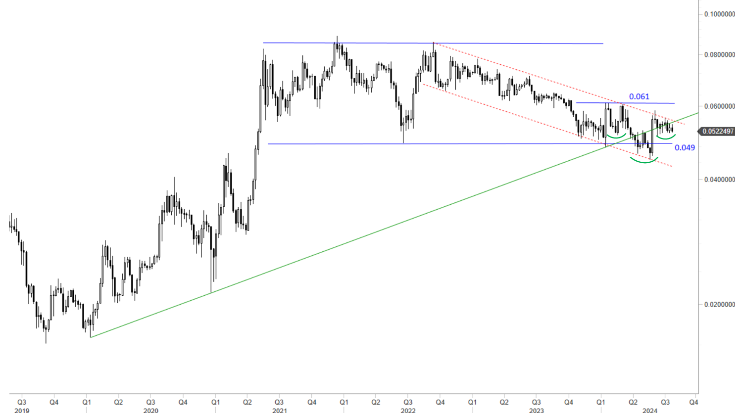 The weekly scale price chart of ETHBTC might be forming a bottom reversal close to the lower boundary of its horizontal consolidation. The pair has been in a downtrend channel (red dashed channel) with the upper boundary acting as resistance. Completion of the possible H&S bottom reversal can also reverse the downtrend.