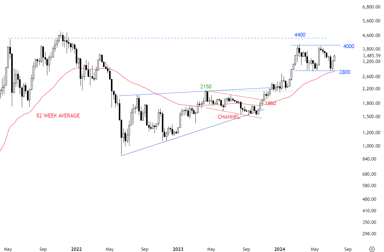 Long-term resistance stands at 4,400 levels. Uptrend is intact. The boundaries of the latest consolidation are better defined with support at 2800 and resistance at 4000 levels. The lower boundary of the recent sideways consolidation at 2,800 levels overlaps with the year-long average. Breakdown below 2,800 levels can complete the rectangle, breach the year-long average and target 1980 levels. However, until a confirmed breakdown takes place, I will view price action as a rectangle consolidation that is trying to find support above the long-term average. Breakout above 4,000 should be considered bullish.