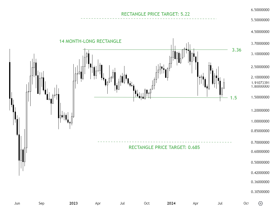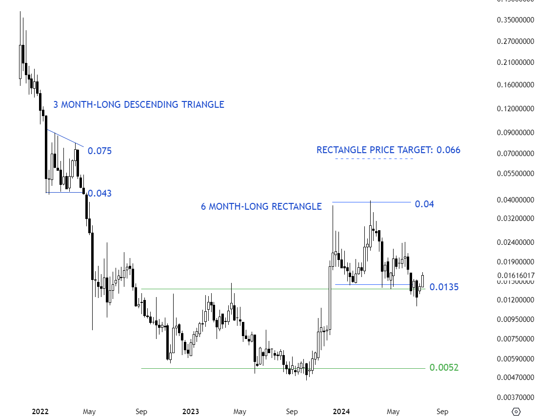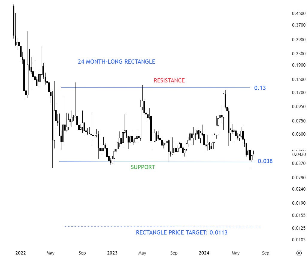 IDEXUSD formed a 2 year-long rectangle with the lower boundary acting as support at 0.038 levels. The lower boundary has been tested several times and a breakdown can confirm the rectangle as a bearish continuation chart pattern with the price target of 0.0113 levels. Until there is a confirmed breakdown, pair offers trading opportunity between well-defined boundaries.