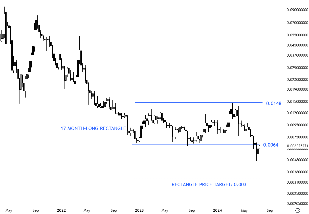 IOSTUSD completed a 4 month-long rectangle in a steady downtrend. Rectangle is acting as a bearish continuation with the recent break down of the horizontal support at 0.0064 levels. Possible price target for the rectangle stands at 0.003 levels. Previous support at 0.0064 becomes the new resistance. A quick recovery above 0.0064 levels in the following weeks can be taken as a failed breakdown signal. Recovery back above 0.0064 levels can put the price back to the trading range between 0.0064 and 0.0148 levels.