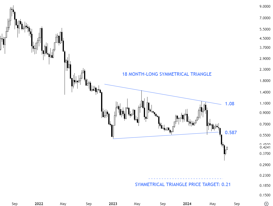 KAVAUSD formed an 18 month-long symmetrical triangle with the lower boundary acting as support at 0.587 levels. The lower boundary has been tested several times and looks like a valid trend line. Breakdown from the symmetrical triangle is now resuming the existing downtrend towards price objective at 0.21 levels.